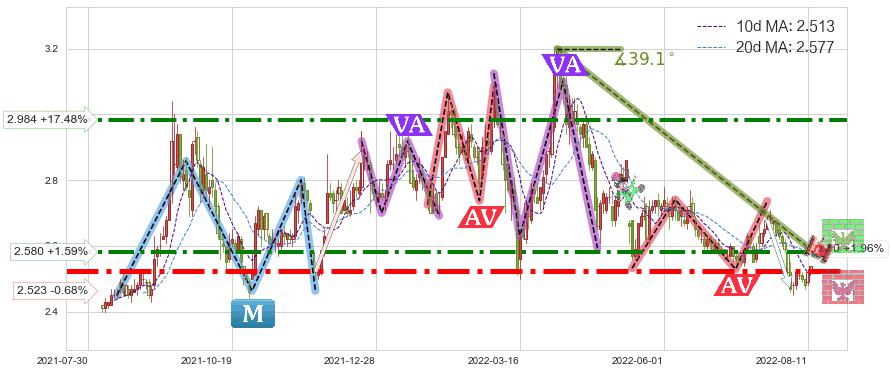 ♘ 阻力价格位2.580,可信任强度74.22%,距离最后交易2022-08-12形成的收盘价格2.540相差 +1.59%