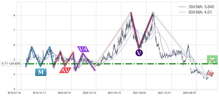 ♘ 阻力价格位4.71,可信任强度83.82%,距离最后交易2022-08-12形成的收盘价格3.780相差 +24.60%