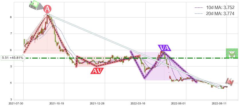 ♘ 阻力价格位5.51,可信任强度69.72%,距离最后交易2022-08-12形成的收盘价格3.780相差 +45.81%
