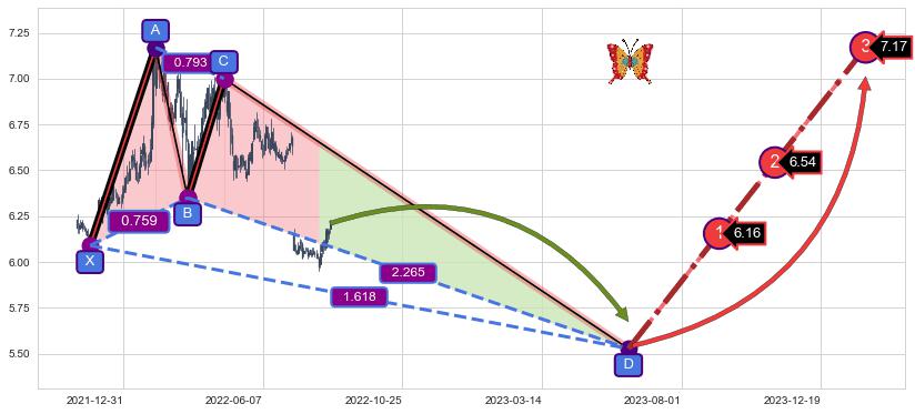 ➣ 未完成【蝴蝶】形态起点X: 2021-11-29, 已到达C点: 2022-04-22, 预测最终D点: 2023-06-08, 共379交易日
