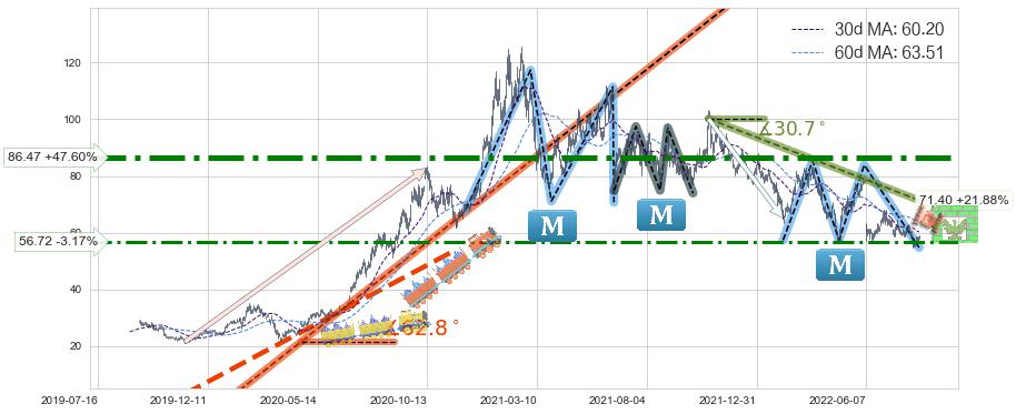 ♘ 阻力价格位86.47,可信任强度88.55%,距离最后交易2022-08-12形成的收盘价格58.58相差 +47.60%