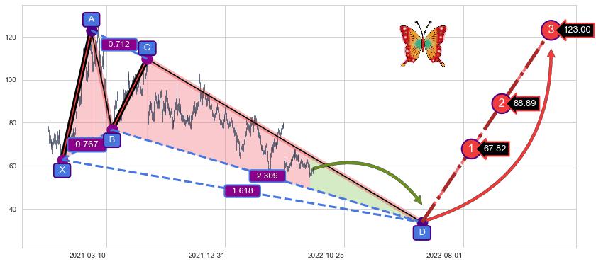 ➢ 谐波蝴蝶:c下跌临近d:猜想拉升 → 上涨 →【拐点】强支撑临近 → 大趋势均值回复
