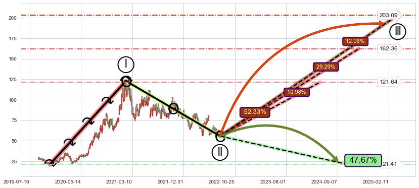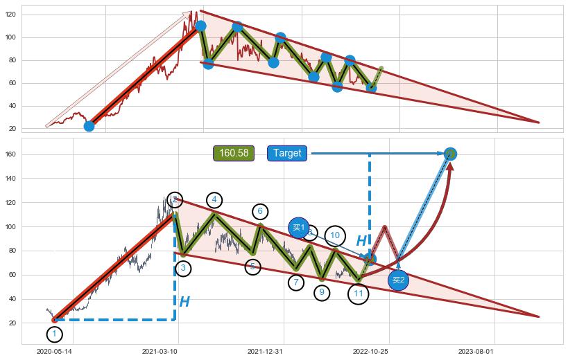 ➣ D点拟合预测价格33.72,距离最后交易收盘价格58.58相差 -42.44%
