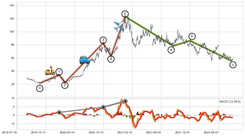 ➣ 波浪理论:猜想达到c点后小回调终止反转上涨 → 上涨 → 【拐点】临近 → 阶段均值回复结束后继续大周期趋势跟踪