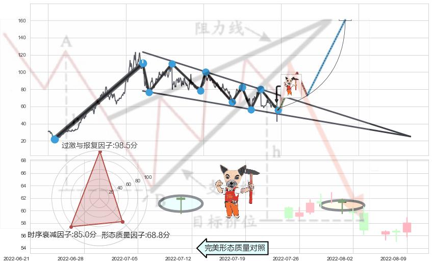 ➢ 上涨螺旋桨形态 🔜 降楔型临近阻力猜想转换支撑上涨 综合量化分数:56.50 【偏多】