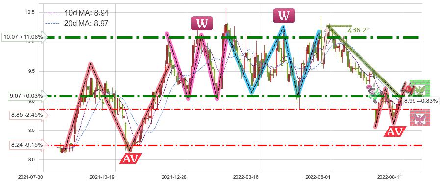 ➢ 【已确认突破】最后价格:9.07与最小【整理】第一目标价格→(2022-08-18: 8.56 )相较: 下跌空间【较小】