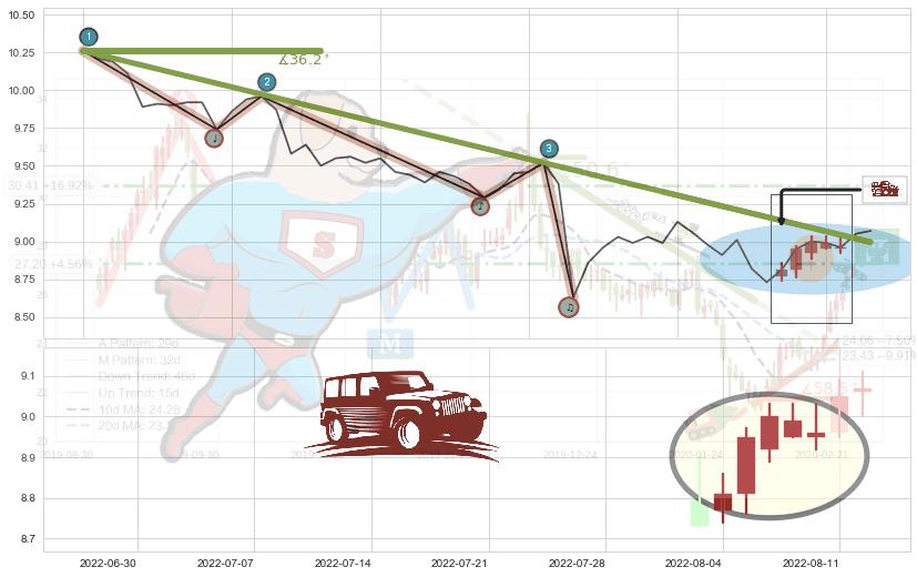 🦴 长线均值回复组合短线趋势跟踪[强阻力信号]2022-05-30-2022-07-25下跌趋势依然成立(下跌趋势跟踪依然存在),短线价格略微上行反弹(均值回复猜想),即将接近下跌趋势提供的未破位阻力价格:8.99。
