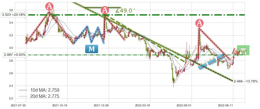 ♘ 阻力价格位3.523,可信任强度75.07%,距离最后交易2022-08-12形成的收盘价格2.860相差 +23.18%