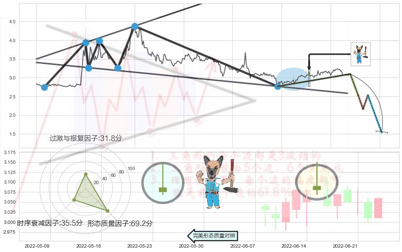 ➢ 下跌镊子线(n形磁铁) + 扩散三角反转临近支撑猜想转换阻力下跌信号叠加后【反向回撤率】中等,【看空】信号叠加【存续影响中等】