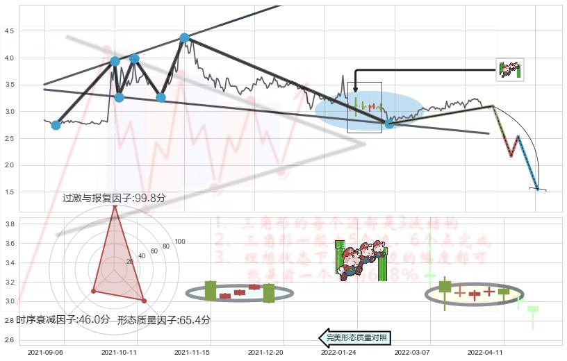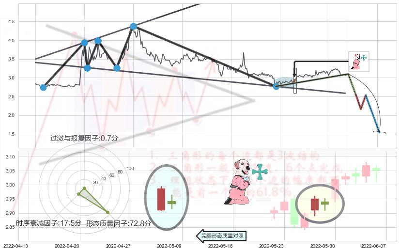 ➢ 下降三部曲(降势三鹤) + 扩散三角反转临近支撑猜想转换阻力下跌信号叠加后【反向回撤率】偏高,【看空】信号叠加【存续影响降权】
