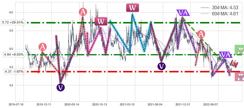 ♘ 阻力价格位4.84,可信任强度72.58%,距离最后交易2022-08-12形成的收盘价格4.46相差 +8.53%