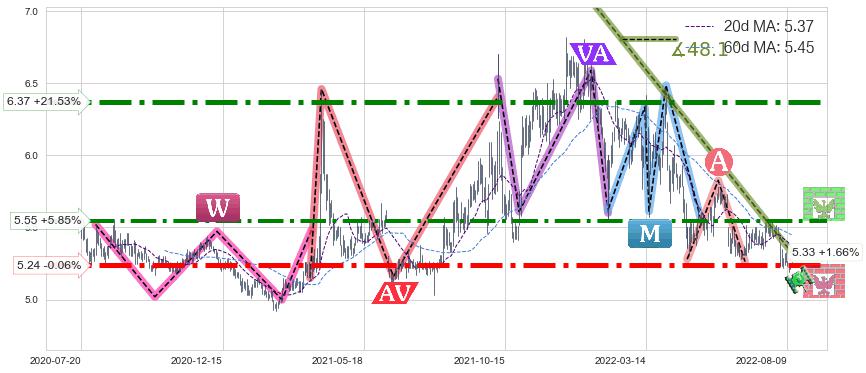 ♘ 阻力价格位5.55,可信任强度82.25%,距离最后交易2022-08-12形成的收盘价格5.24相差 +5.85%