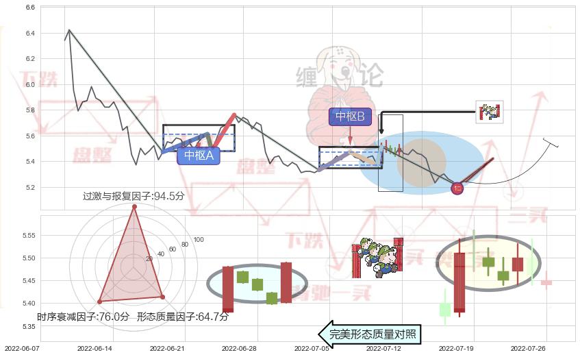 ➣ 【中枢B】:2022-06-28-2022-07-18,中枢由4笔构成,共15交易日, ZG=5.47, ZD=5.37