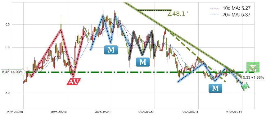 2022-06-22: 时域附近第一阻力位5.45持续的对下跌趋势进行阻拦,有效地放缓了下跌的速度。