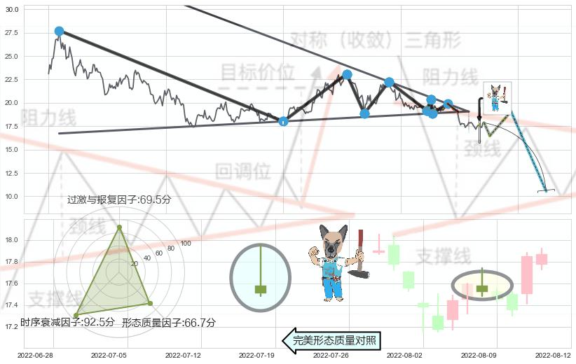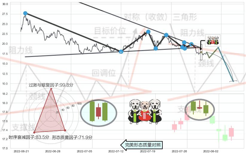 ➢ 射击之星形态 🔜 下降对称三角整理支撑破位转换阻力下跌 综合量化分数:38.59 【偏空】