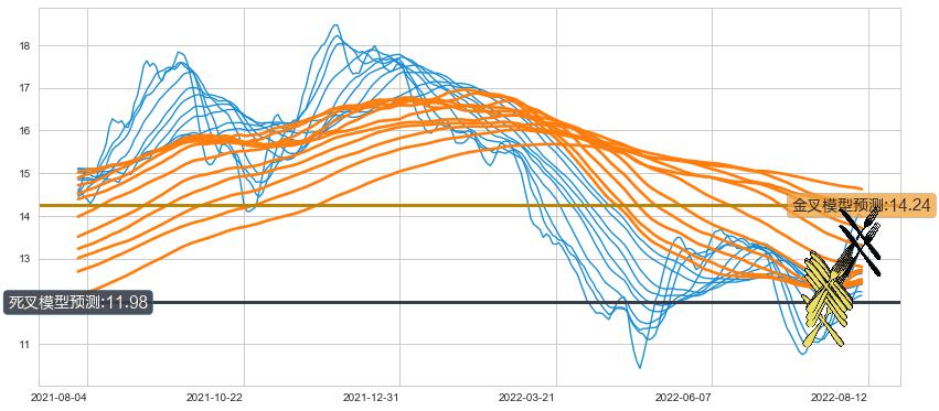 ➢ 10小时均线于(2022-08-11: 13.56)形成【死叉】基于【死叉历史模型】预测死叉后最低波谷价格: 12.24, 死叉后最低价格13.29,尚未达到预测最低波谷价格, 预期继续下跌