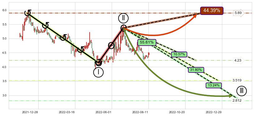 ➣ 循环浪继续向下【平均值】位置(2022-12-22, 3.519),匹配聚类样本比例57.18%, 可能性概率31.80%
