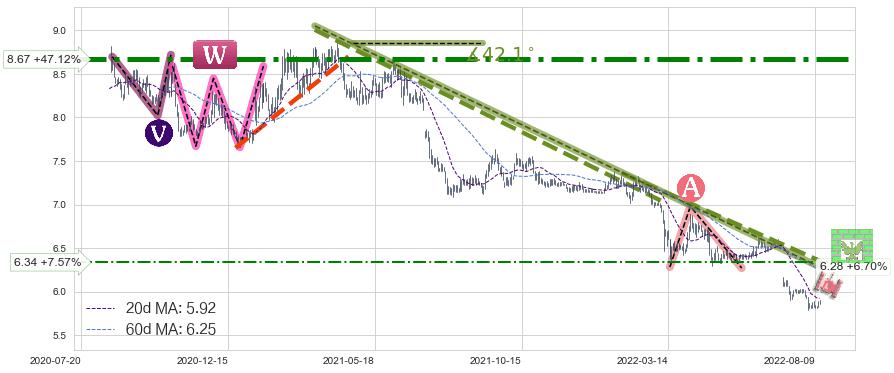 ♘ 阻力价格位8.67,可信任强度98.11%,距离最后交易2022-08-12形成的收盘价格5.89相差 +47.12%