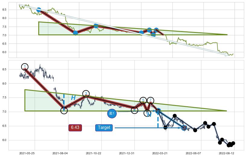 ➢ 【多方力量耗尽,空方打破攻守平衡点】下降三角形中继整理, 已在2022-02-28突破【支撑】颈线 7.03 →演变成下降通道