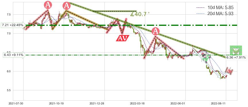 ♘ 阻力价格位7.21,可信任强度84.54%,距离最后交易2022-08-12形成的收盘价格5.89相差 +22.45%
