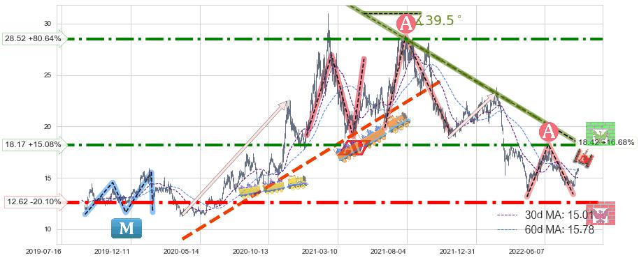 ♘ 阻力价格位18.17,可信任强度84.22%,距离最后交易2022-08-12形成的收盘价格15.79相差 +15.08%