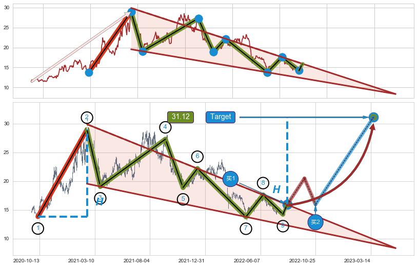 ➢ 最小中继整理涨幅→𝐇: 15.17 (𝐇楔型旗杆的长度:楔型起点→顶点)