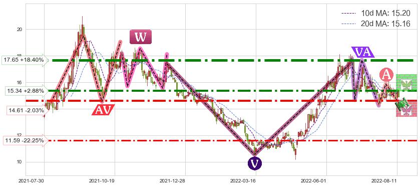 ♘ 阻力价格位15.34,可信任强度76.53%,距离最后交易2022-08-12形成的收盘价格14.91相差 +2.88%