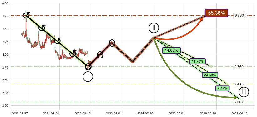 ➣ 循环浪继续向下【平均值】位置(2026-10-19, 2.413),匹配聚类样本比例52.33%, 可能性概率23.35%
