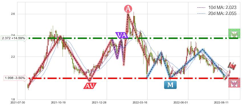 ♘ 阻力价格位2.372,可信任强度93.30%,距离最后交易2022-08-12形成的收盘价格2.070相差 +14.59%