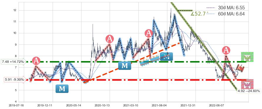 ♘ 阻力价格位7.48,可信任强度86.18%,距离最后交易2022-08-12形成的收盘价格6.52相差 +14.72%