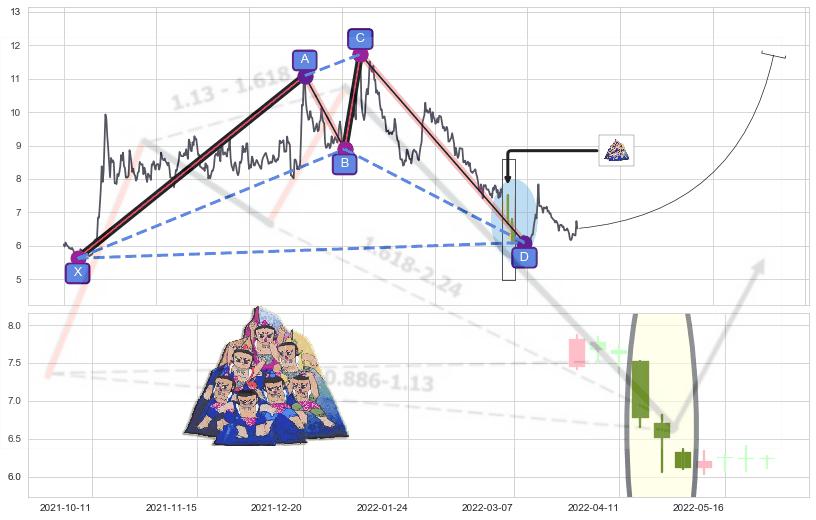 ➣ 谐波鲨鱼:已到达d点:猜想c下行到达d点后报复性拉升上涨(均值回复)