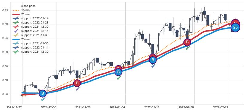 ➢ 最优均线组合共正确确认支撑阻力信号10处,正确确认率 71.43%