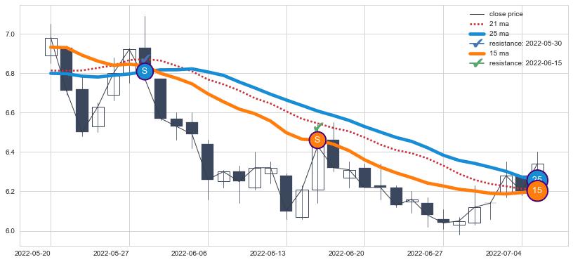 ➣ 15小时均线于(2022-07-20: 6.38)形成【死叉】基于【死叉历史模型】预测死叉后最低波谷价格: 6.15, 死叉后最低价格5.47,已经下跌超出预测最低波谷价格, 预期反弹