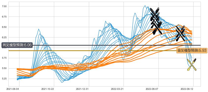 ➢ 70小时均线于(2022-06-02: 6.45)形成【死叉】基于【死叉历史模型】预测死叉后最低波谷价格: 5.90, 死叉后最低价格5.47,已经下跌超出预测最低波谷价格, 预期反弹