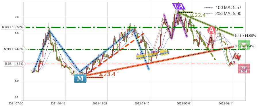 ♘ 阻力价格位5.98,可信任强度55.54%,距离最后交易2022-08-12形成的收盘价格5.62相差 +6.48%