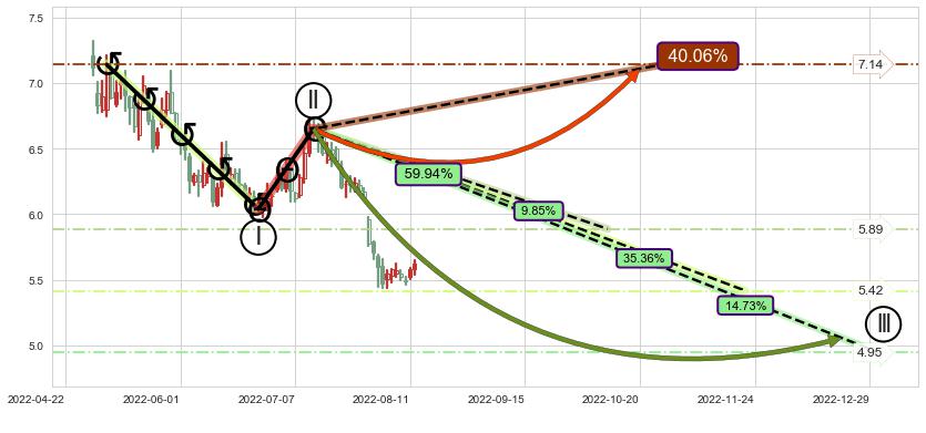 ➣ 循环浪继续向下【平均值】位置(2022-11-22, 5.42),匹配聚类样本比例59.00%, 可能性概率35.36%