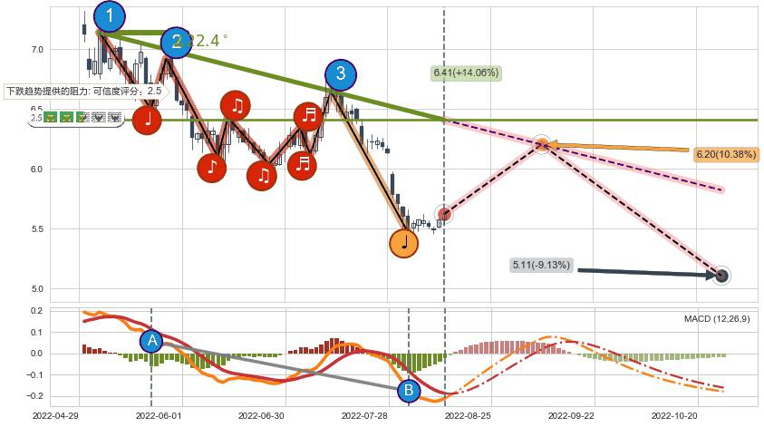 ➢ 【仅预测突破】最后价格:5.62与预测突破价格:6.35→【空间中等】后续最小【整理】第一目标价格→(2022-10-27: 7.74 )