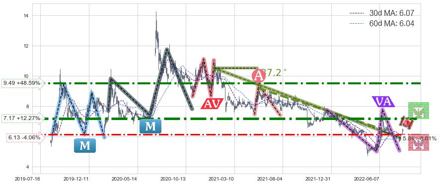 ♘ 阻力价格位7.17,可信任强度88.53%,距离最后交易2022-08-12形成的收盘价格6.39相差 +12.27%