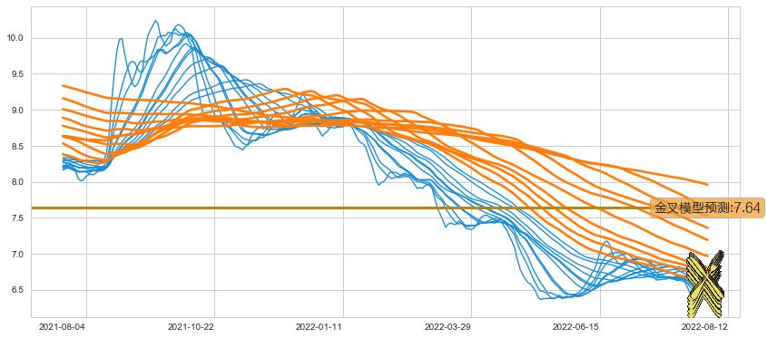 ➣ 40小时均线于(2022-08-11: 6.68)形成【金叉】基于【金叉历史模型】预测金叉后最高波峰价格: 7.65, 金叉后最高价格6.78,尚未达到预测最高波峰价格, 预期继续上涨