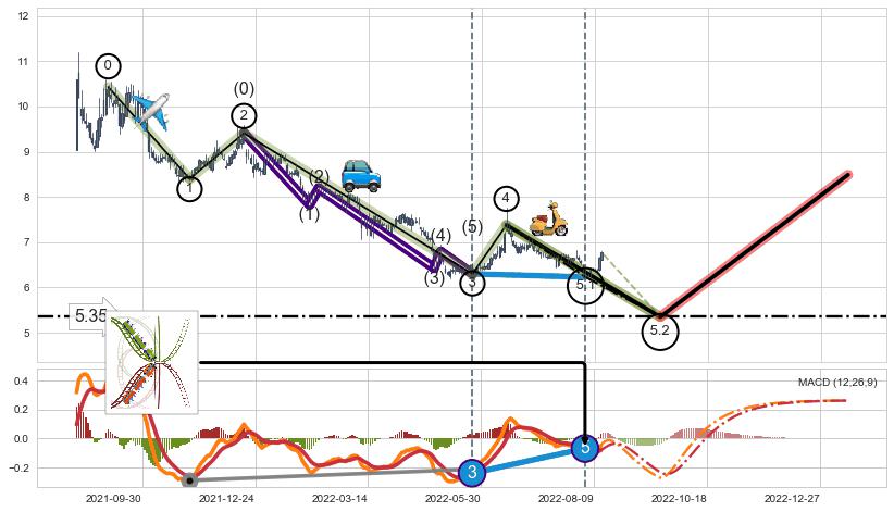 ➣ 波浪理论:猜想即将止跌 → 上涨 →【拐点】浪5临近 → 大趋势均值回复