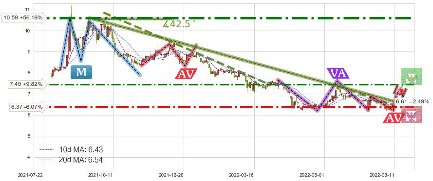 ♘ 阻力价格位10.59,可信任强度95.30%,距离最后交易2022-08-12形成的收盘价格6.78相差 +56.19%