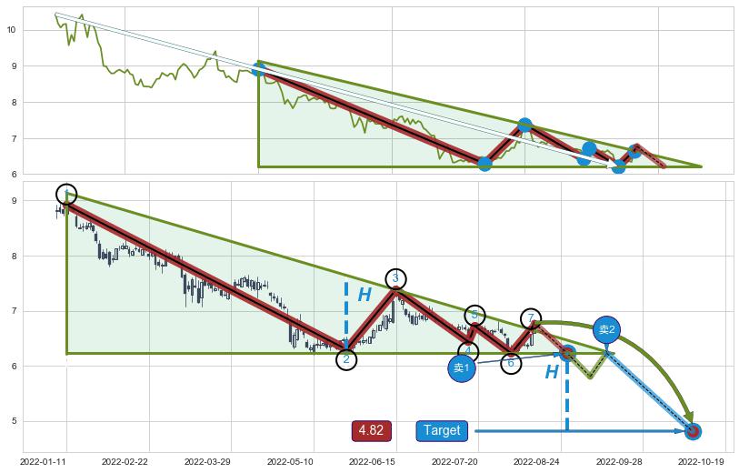 ➣ 【未确认突破,预测即将形成突破】下降三角形整理起点:2022-01-11, 预测突破点:2022-08-26,形态共153交易日