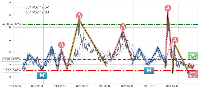 ♘ 阻力价格位24.50,可信任强度58.74%,距离最后交易2022-08-12形成的收盘价格17.13相差 +43.00%