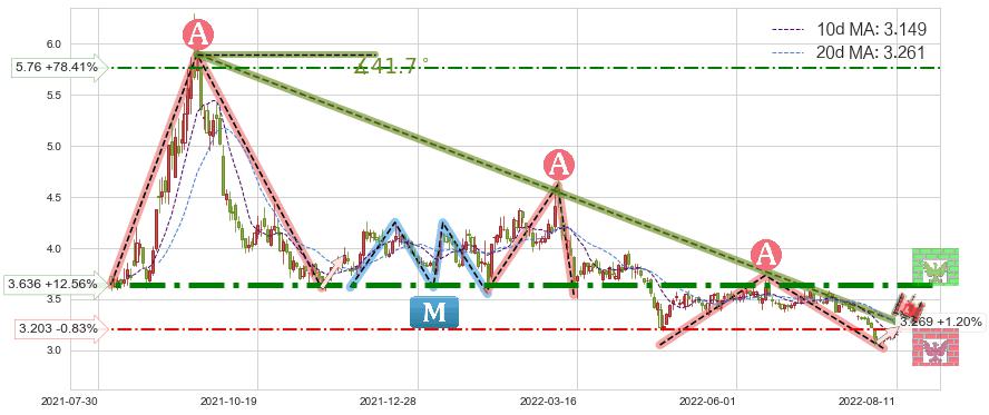 ♘ 阻力价格位3.636,可信任强度91.36%,距离最后交易2022-08-12形成的收盘价格3.230相差 +12.56%