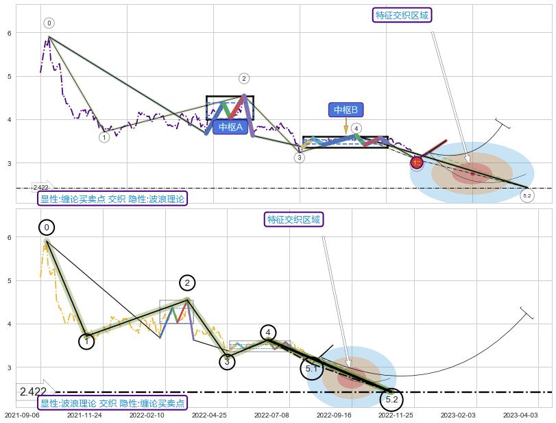 ➢ 【中枢A】:2022-01-28-2022-03-15,中枢由5笔构成,共28交易日, ZG=4.37, ZD=4.02