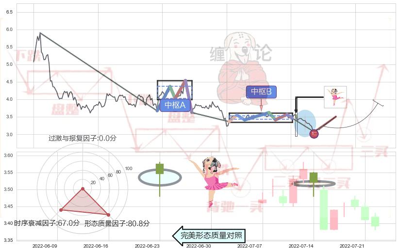 ➣ 【中枢B】:2022-04-27-2022-07-11,中枢由7笔构成,共50交易日, ZG=3.550, ZD=3.460