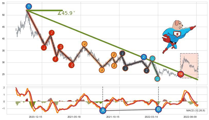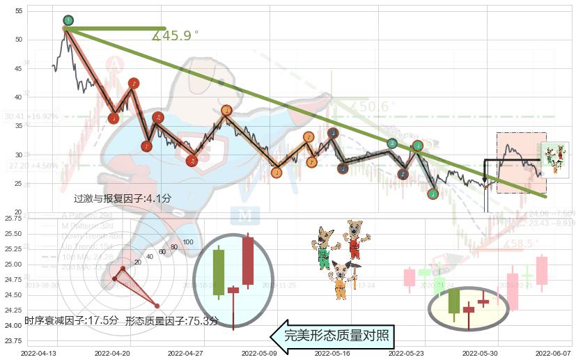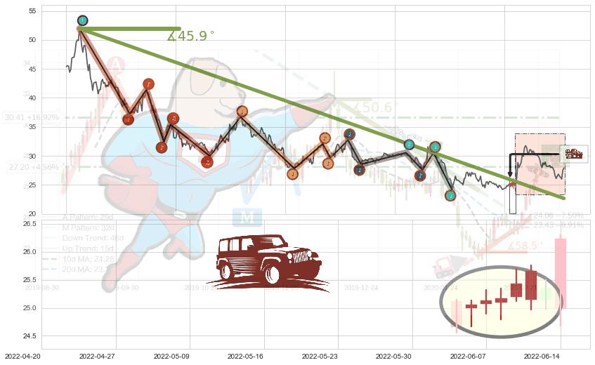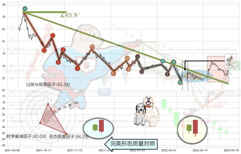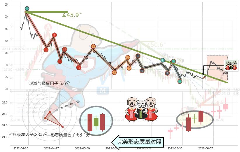 ➣ 2020-10-21-2022-04-01下跌趋势存在反转上涨[机会],其原下跌趋势的阻力位(22.66)已被突破[强支撑信号],原下跌趋势角度: 45.9˚
