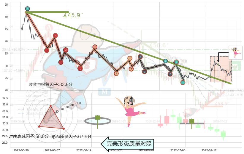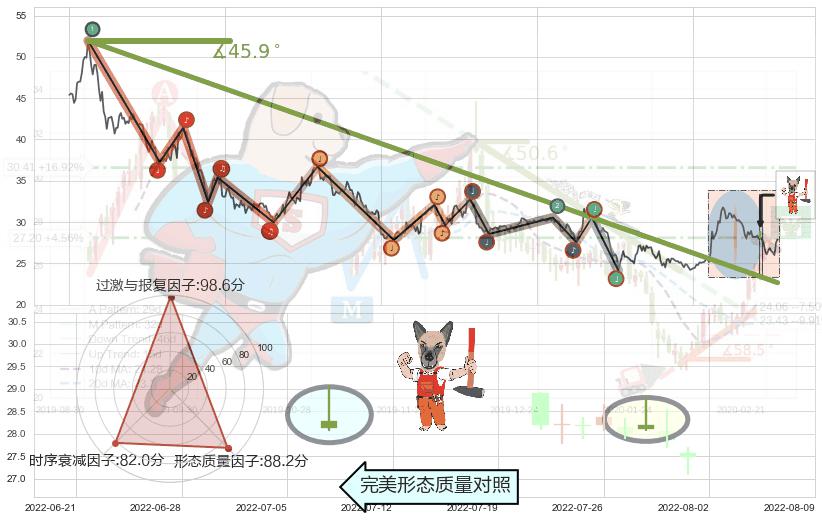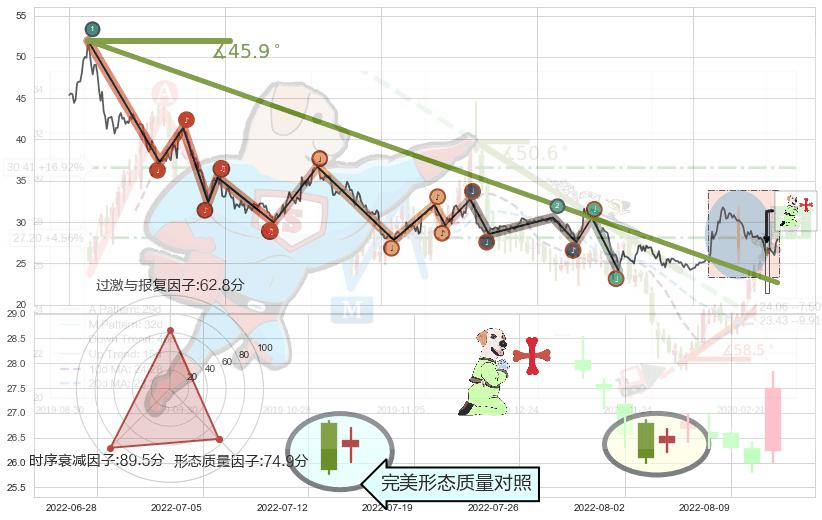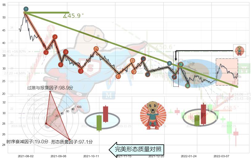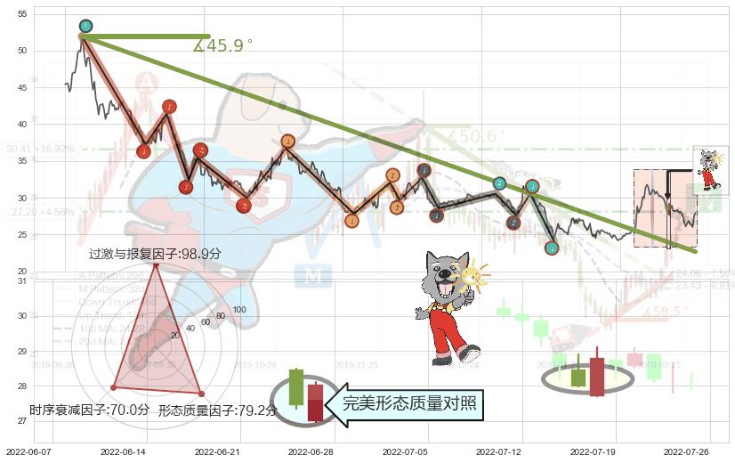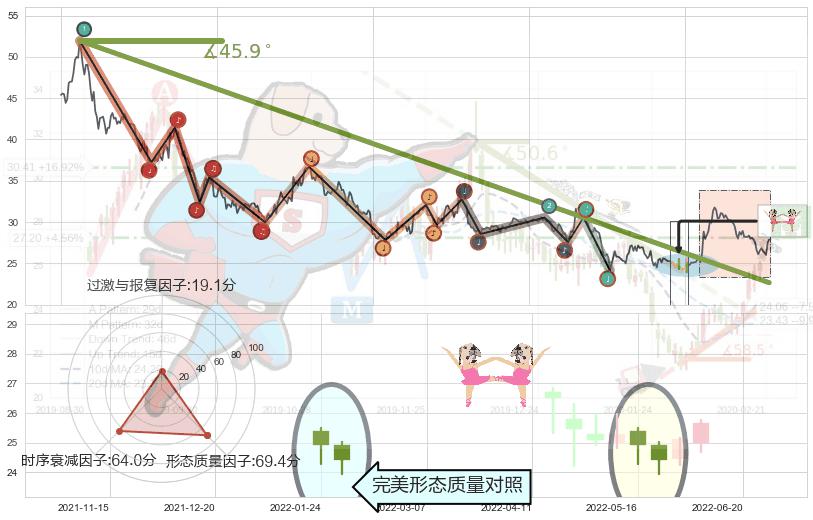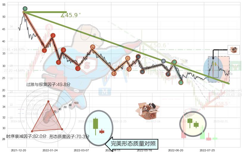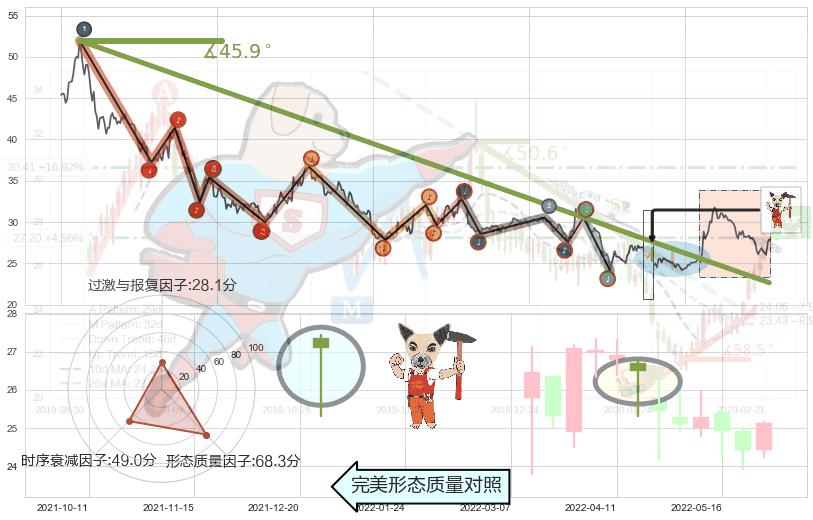 ➢ 2020-10-21-2022-04-01下跌趋势存在反转上涨[机会],其原下跌趋势的阻力位(22.66)已被突破[强支撑信号],原下跌趋势角度: 45.9˚