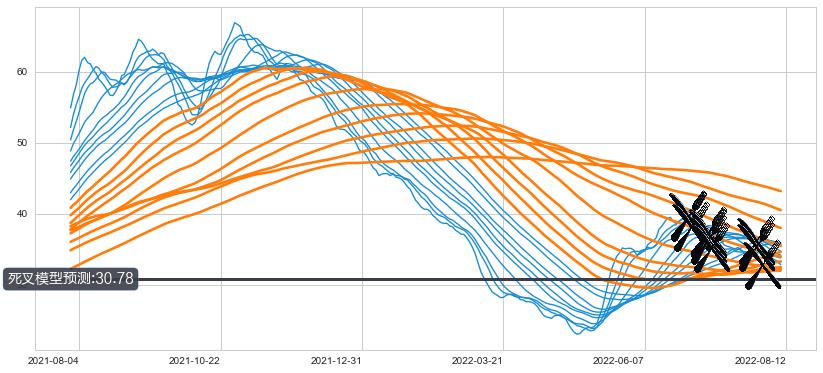 ➣ 30小时均线于(2022-07-07: 37.32)形成【死叉】基于【死叉历史模型】预测死叉后最低波谷价格: 34.26, 死叉后最低价格31.55,已经下跌超出预测最低波谷价格, 预期反弹