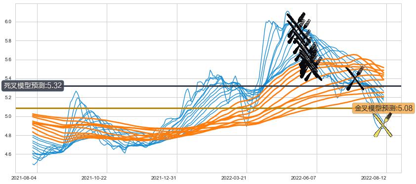 ➣ 80小时均线于(2022-05-27: 5.56)形成【死叉】基于【死叉历史模型】预测死叉后最低波谷价格: 5.21, 死叉后最低价格4.82,已经下跌超出预测最低波谷价格, 预期反弹
